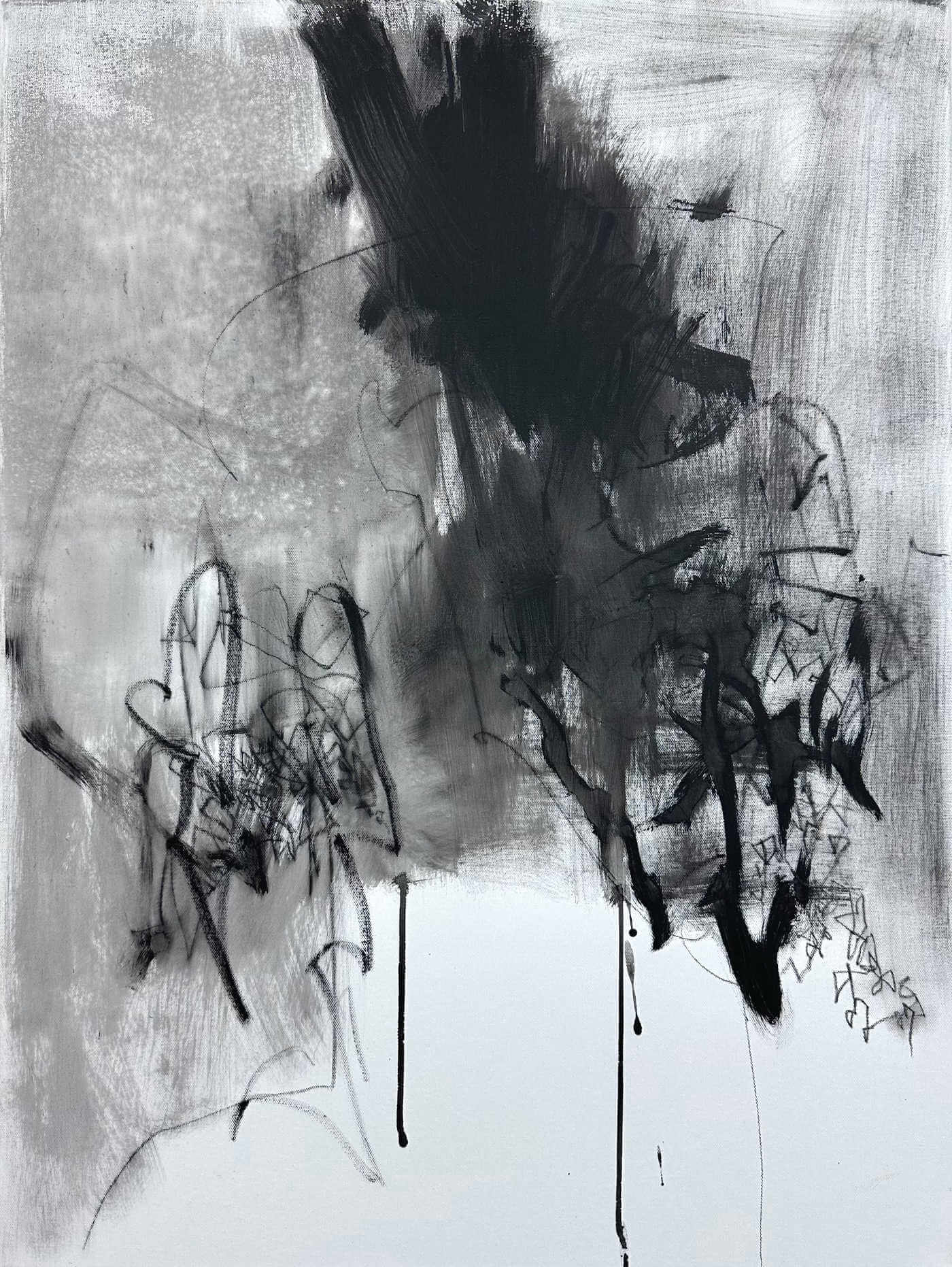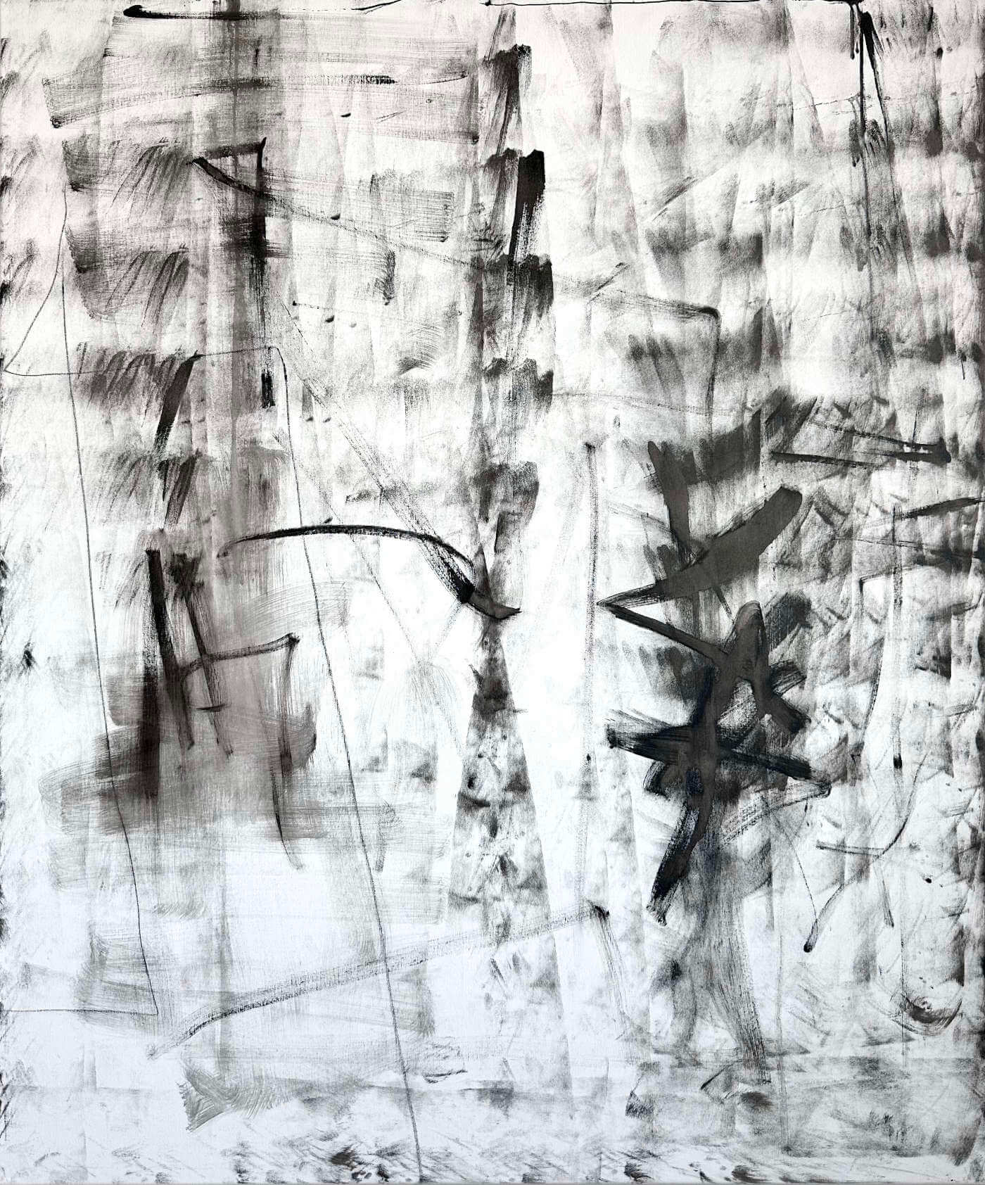 The Berlin City Noise series explores the urban hustle and bustle of Berlin through a monochrome black series in which she depicts abstract everyday scenes and emotional nuances of city life. Inspired by Berlin's wintry grey skies and the city's deep connection to the color black - especially in the techno scene - her images convey a raw, atmospheric energy. Her surfaces draw directly from the city’s rough textures: crumbling façades, weathered walls, and tags partly washed down by the rain. This urban vocabulary shapes her approach. She uses water as an active tool, removing pigment, letting it run or break apart. The resulting shifts in tone and texture echo the worn, time-etched marks found throughout the city. Layers of gray fog and dynamic brushstrokes evoke movement and emotion, immersing the viewer in an animated yet introspective world. Using acrylic, spray paint, oil pastels and soft pastel, she experiments with different techniques that reflect the contrasts and complexity of the city.