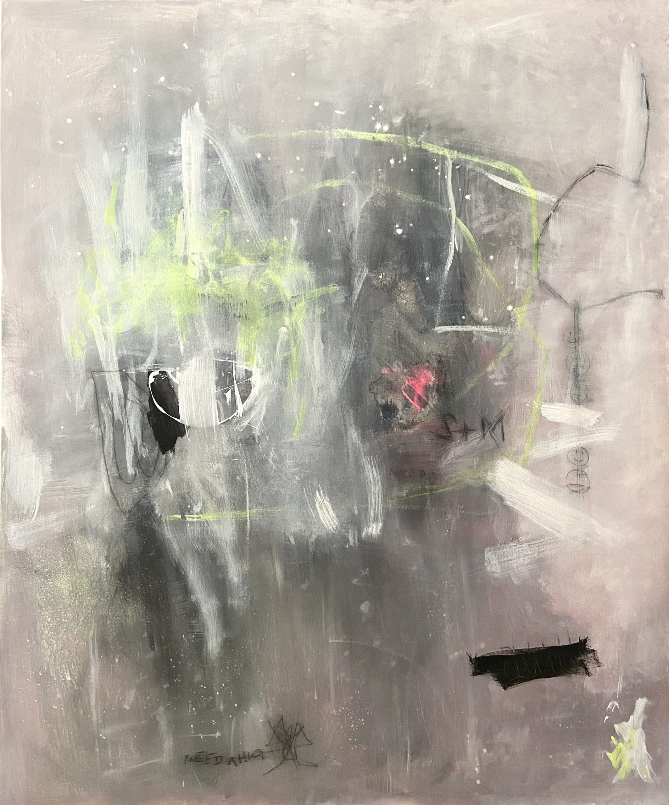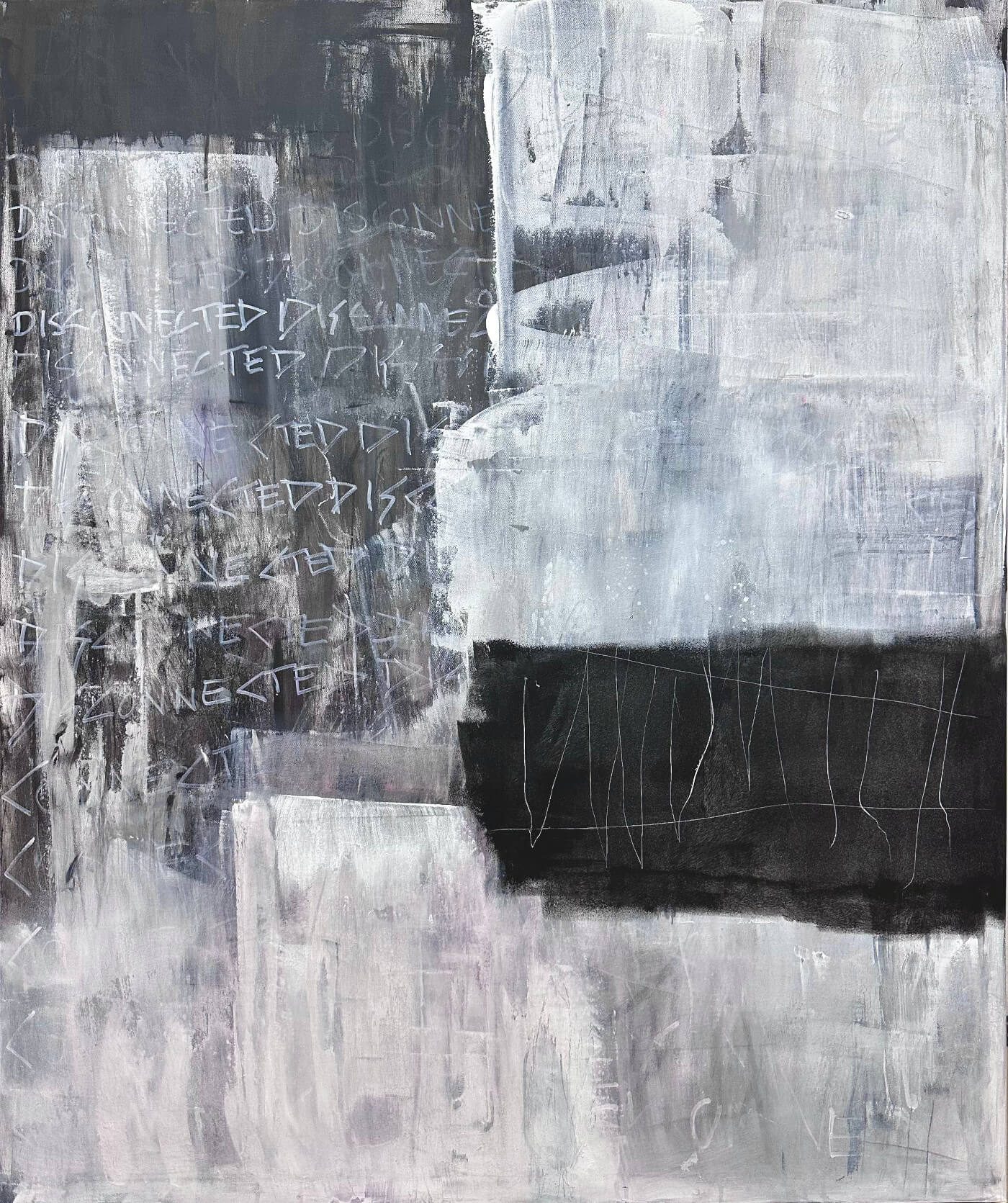Exploring the interplay between contrast and harmony, she employs a diverse array of painting media including acrylic, texture paste, oil pastel crayons, charcoal, and spray cans. Occasionally, sayings can be discerned within the compositions. The application of colors involves layering and partial removal, mirroring the weathering effects.